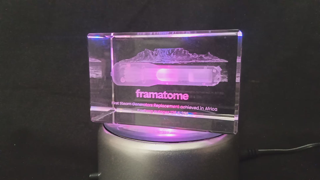 Example of crystal plaque for a wedding gift sitting inside a custom made timber light base